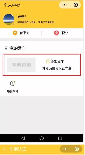 雷諾車主,廠家福利大派送 小諾準備大聲地告訴您: 是時候動動手 把小諾為您準備的精美禮品 帶回家啦! 一等獎:東風雷諾云伴遠程視頻車 二等獎:東風雷諾反向傘 方便車主而貼心設計,大雨來臨之時,只需小小的車門縫,就可以開收傘自如。 三等獎:東風雷諾定制手機支架 強韌有力的工藝設計,保證手機在行車途中不會晃動、掉落。讓開車接聽電話更安全。 諾米們是不是已經(jīng)按捺不住了 快跟著小諾 收下攻略,動動手指 把禮品帶回家吧! 先關注東風雷諾車友會官方微信公眾號 返回東風雷諾車友會主頁面,點擊左下角菜單欄【個人中心】,進入車主認證通道。 認真填寫愛車信息,上傳行駛證主頁、副業(yè)。在行駛證上能找到您的車輛識別代號和發(fā)動機號,再輸入手機號和驗證碼,即可綁定成功啦! 完成認證,便可以開始抽獎啦!注意:一位車主只有一次抽獎機會哦。 如您中獎,您將會收到一條中獎短信通知 務必在1個月內(nèi)憑中獎短信到武漢法雷專營店領取禮品 *注:本次活動僅限未認證會員的車主參與